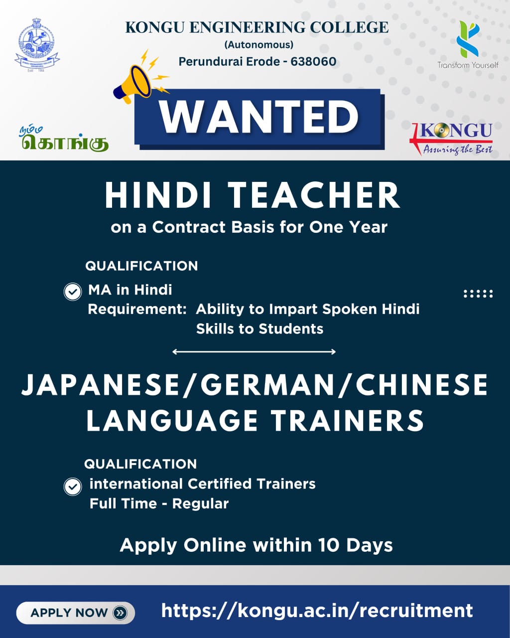 Applications are invited for the following positions from eligible candidates: